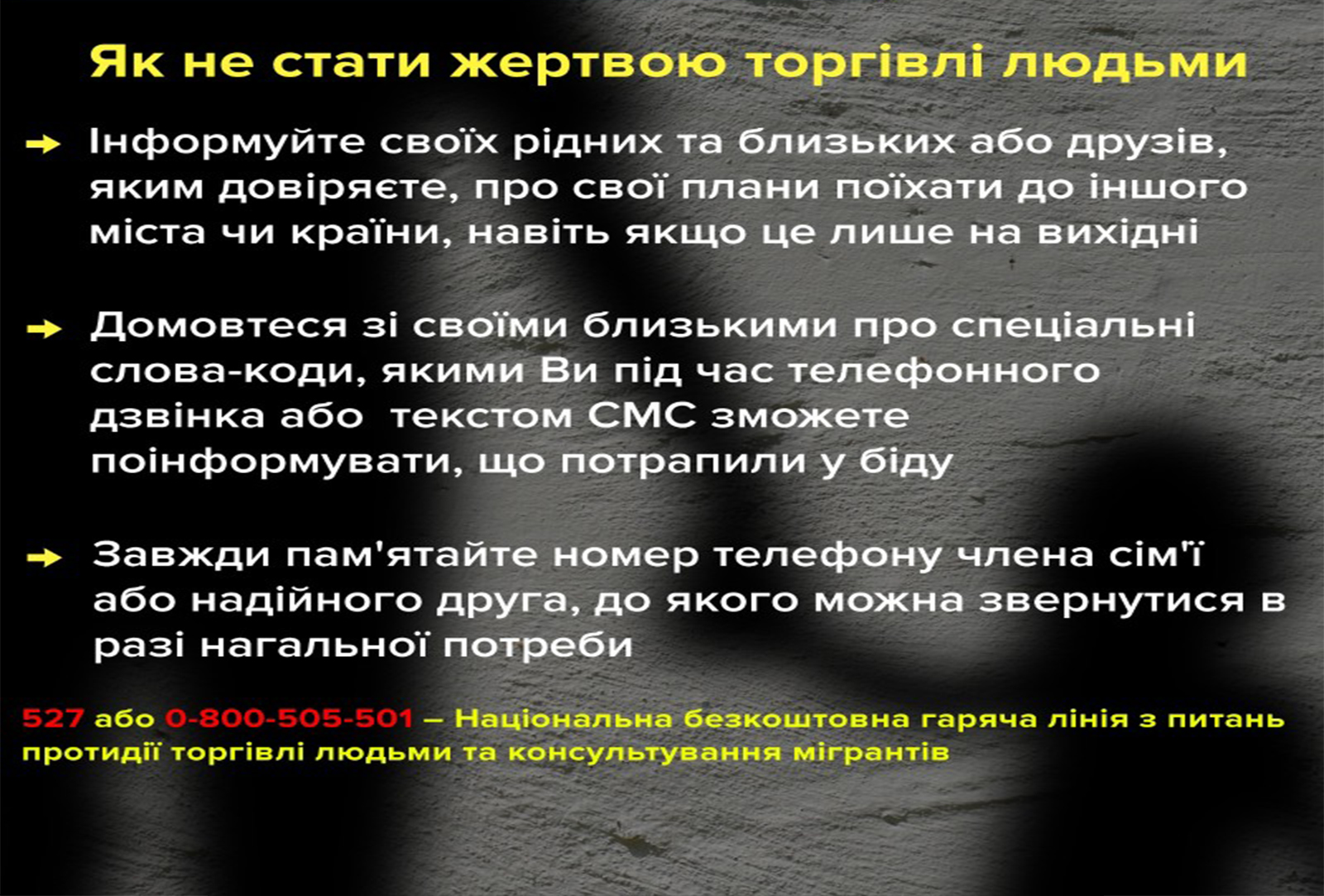 В Україні існує безкоштовна національна «гаряча лінія» з протидії торгівлі людьми та консультування мігрантів – 527 або 0 800 505 501.