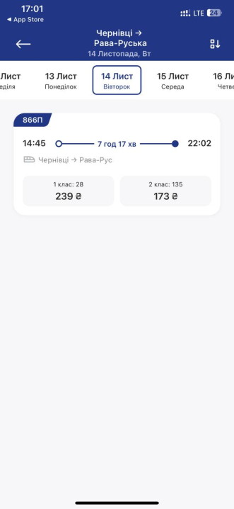 Квитки на всі рейси будуть доступні в застосунку Укрзалізниці, на сайті, в чат-боті та в касах вокзалів. Вартість квитка з Чернівців до Рави Руської складає для: