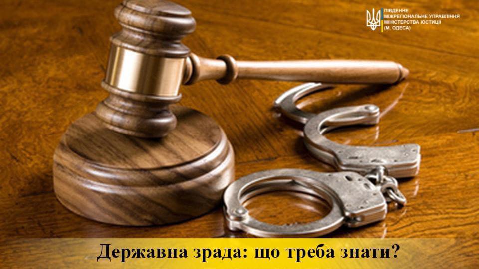 Відповідно до ст. 111 Кримінального кодексу України (ККУ) державна зрада — це діяння, умисно вчинене громадянином України на шкоду суверенітетові, територіальній цілісності та недоторканості, обороноздатності, державній, економічній чи інформаційній безпеці України: перехід на бік ворога в умовах воєнного стану або в період збройного конфлікту, шпигунство, надання іноземній державі, іноземній організації або їх представникам допомоги в проведенні підривної діяльності проти України.
