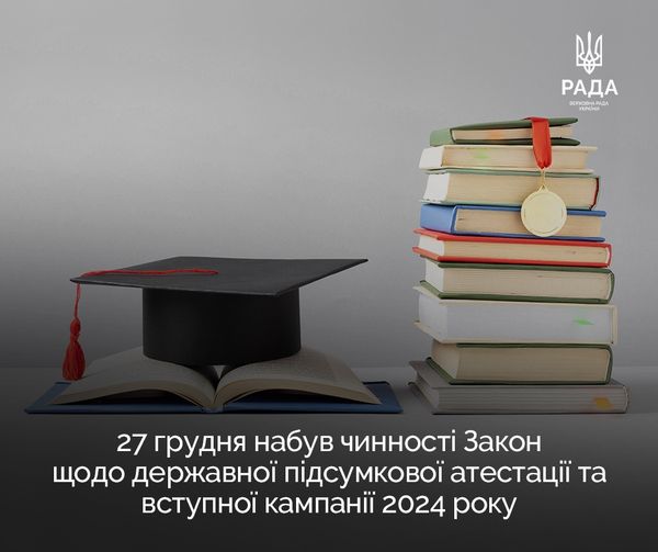 8 листопада 2023 року Верховною Радою України було прийнято Закон України щодо державної підсумкової атестації та вступної кампанії 2024 року (№3438-IX (https://zakon.rada.gov.ua/laws/show/3438-IX#Text)).