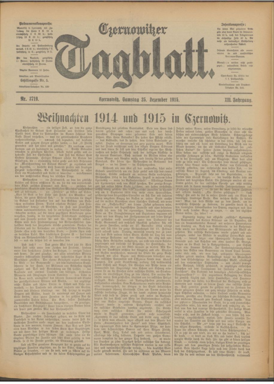Різдво 1915 року чернівчани святкували вже у звільненому від росіян місті. 25 грудня в німецькомовній чернівецькій газеті «Czernowitzer Tagblatt» вийшла стаття під назвою «Різдво 1914 та 1915 років у Чернівцях»: