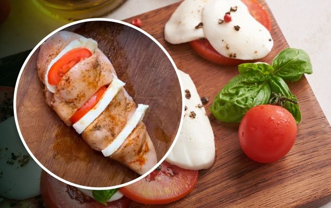 Потім кожний надріз змастіть соусом песто. Моцарелу і томат наріжте кружальцями та вставте в надрізи.