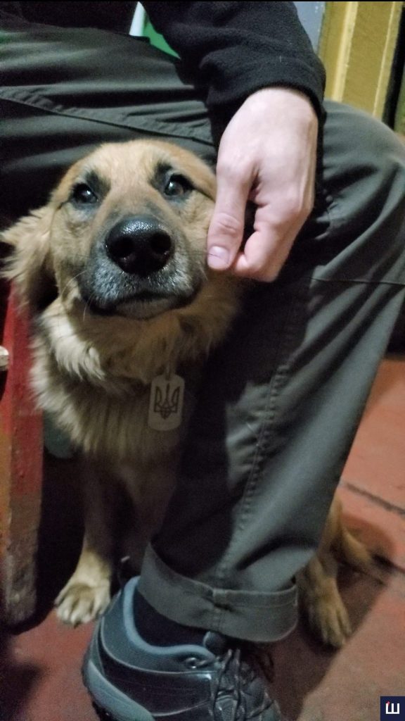 Нас покликали погрітися до каптерки. Там нас радо зустрічає невеликий рудий собака Бейбут. Військові жартома називають його сепаратистом, бо прибіг до них із боку російських позицій під Комишувахою. Прибився цуциком до одного з бійців підрозділу. Тепер подорожує з бійцями усією лінією фронту. Дуже любить кататися транспортом. Здається, що Бейбут любить усіх людей, і з цікавістю прибіг знайомитися до нас.