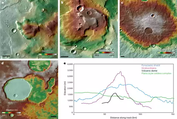У дослідженій області планетологи виявили 63 вулкани, які вони розділили на чотири типи. Вулканічні куполи являють собою найменші утворення, мають середню висоту 0,8 кілометра і середній діаметр 14 кілометрів. Стратовулкани часто демонструють кратери на вершині або на схилах, іноді пов’язані розломами і тріщинами, виділяються найбільшою висотою (два-три кілометри) і діаметром 40-80 кілометрів і, як і куполи, мають круті укоси. Пірокластичні щитові вулкани мають діаметр близько ста кілометрів за висоти в 1,1 кілометра, квазікруглої форми і кратер на вершині або поблизу неї. Важливою характеристикою пірокластичних щитових вулканів і стратовулканів є наявність мереж долин на схилах, що вказує на схильність до ерозії пірокластичних порід. Нарешті, четвертий тип вулканів – комплекси кальдер, що формуються внаслідок вибухового вулканізму, які можуть містити до 14 западин.