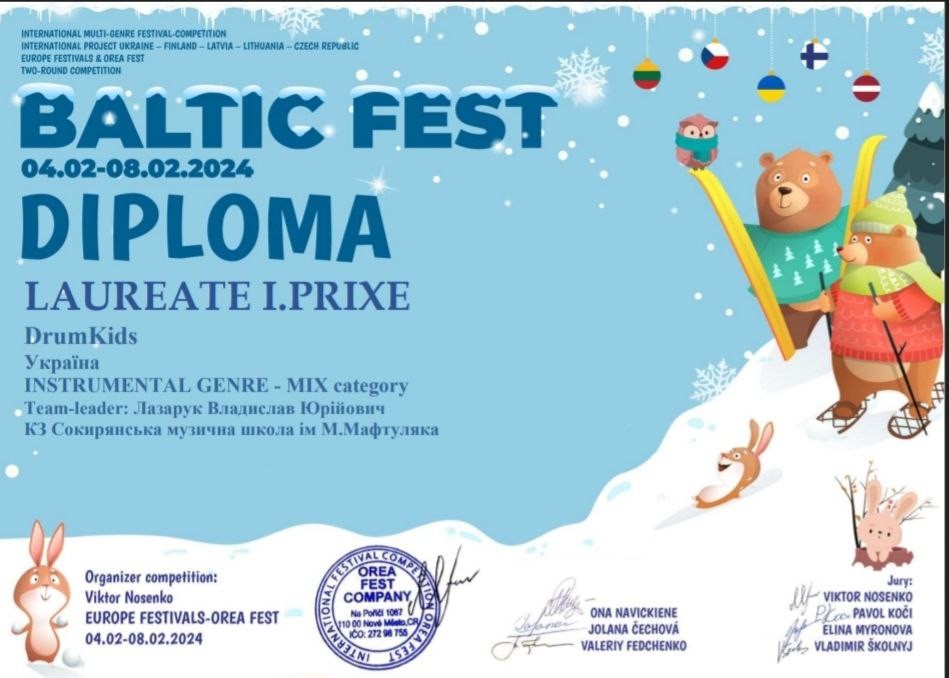 Ансамбль ударних інструментів “DrumKids” взяв участь в Міжнародному багатожанровому двотуровому фестивалі-конкурсі мистецтв «BALTIC FEST 2024». Цікавий репертуар та ретельна підготовка юних музикантів стали запорукою успішного виступу – як результат переможне І місце.
