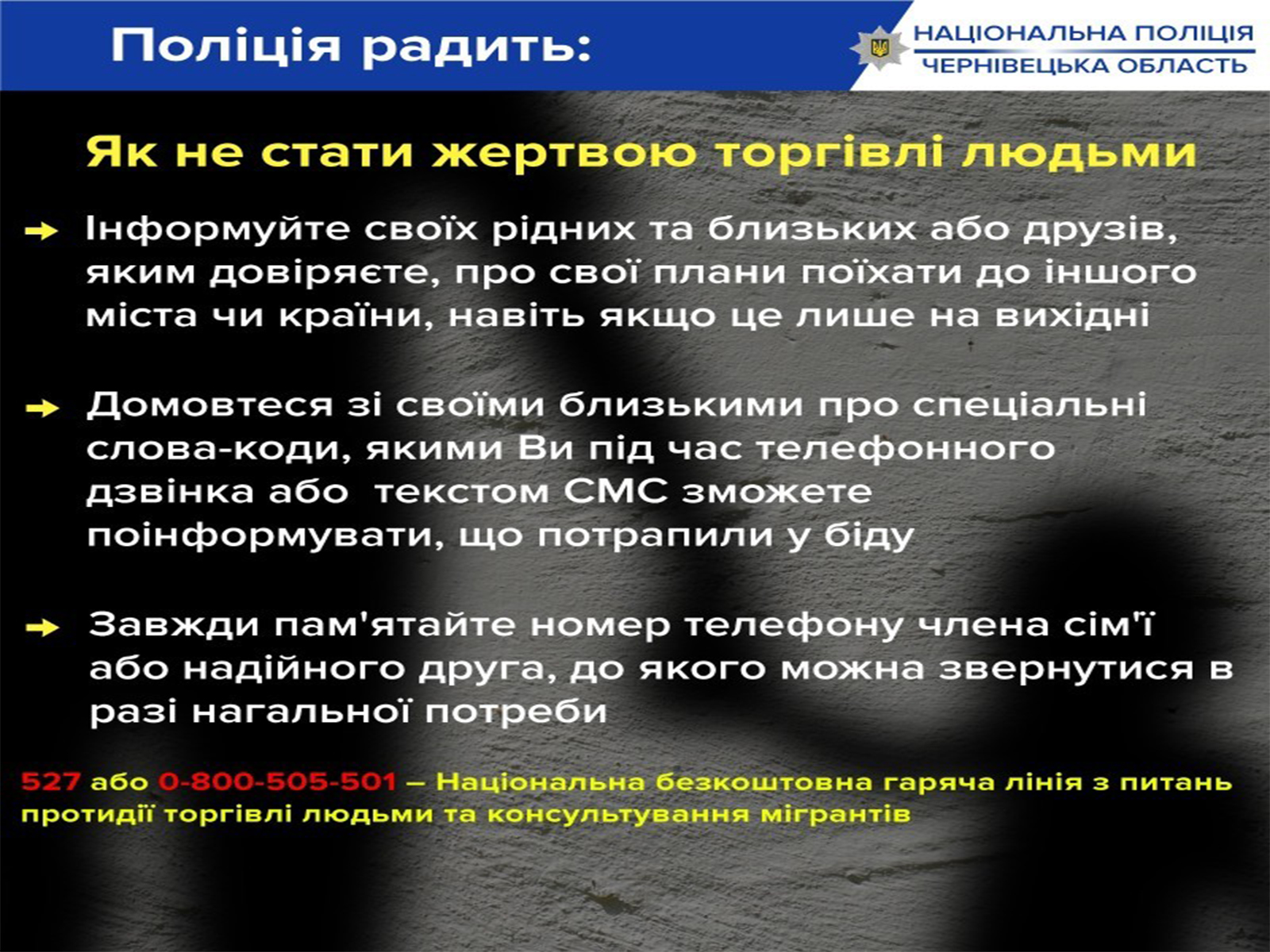 В Україні працює безкоштовна національна «гаряча лінія» з протидії торгівлі людьми та консультування мігрантів – 527, або 0 800 505 501.