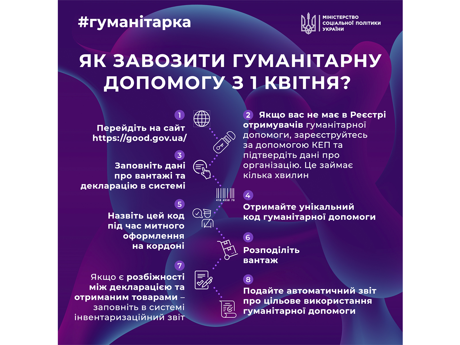 Запрацювала Автоматизована система реєстрації гуманітарної допомоги https://good.gov.ua/. Мета її впровадження – зробити процедуру ввезення та обліку такої допомоги зручнішою та прозорішою.