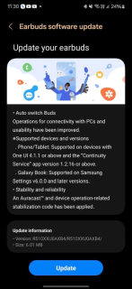 Це оновлення забезпечує функцію автоматичного перемикання Buds Auto Switch для автоматичного підключення бездротових навушників до ноутбуків і ПК Galaxy. Ця функція має працювати з ноутбуками серії Galaxy Book 3 і Galaxy Book 4. Для роботи нової функції потрібен смартфон з One UI 4.1.1 (або новішої версії) і додаток Continuity Service (версія 1.2.16 або новіша). На Galaxy Book також повинні бути встановлені налаштування Samsung (версія 6.0.0.0 або новіша).