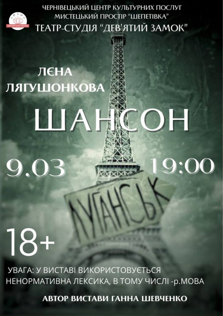У Чернівцях 9 березня відбудеться драма-квест «Шансон» (авторка Лєна Лягушонкова) від театру-студії «Девʼятий замок» (авторка та режисерка Ганна Шевченко). Виставу зіграють о 19:00 у залі КБУ «Чернівецький центр культурних послуг» Мистецький простір «Шепетівка».