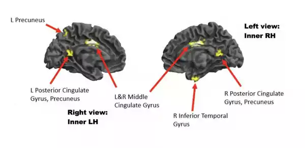 Внутрішні зображення лівого і правого мозку показали ділянки зниженої мозкової активності, коли музиканти з великим досвідом перебували у стані високого потоку (порівняно з низьким). Ці ділянки включають ключові вузли мережі мозку за замовчуванням. Drexel University