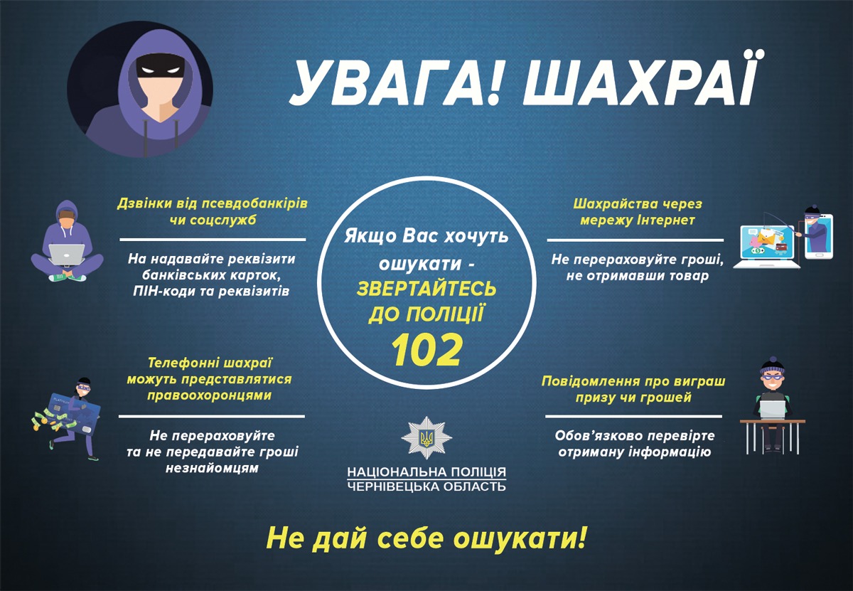 Зважаючи, на те, що випадки вчинення шахрайства на Буковині є поширеними і зловмисники завдають своїм жертвам збитків на десятки тисяч гривень, поліція Чернівецької області вкотре закликає громадян не втрачати пильності та нагадує прості правила, що допоможуть вберегти гроші від злочинних посягань: