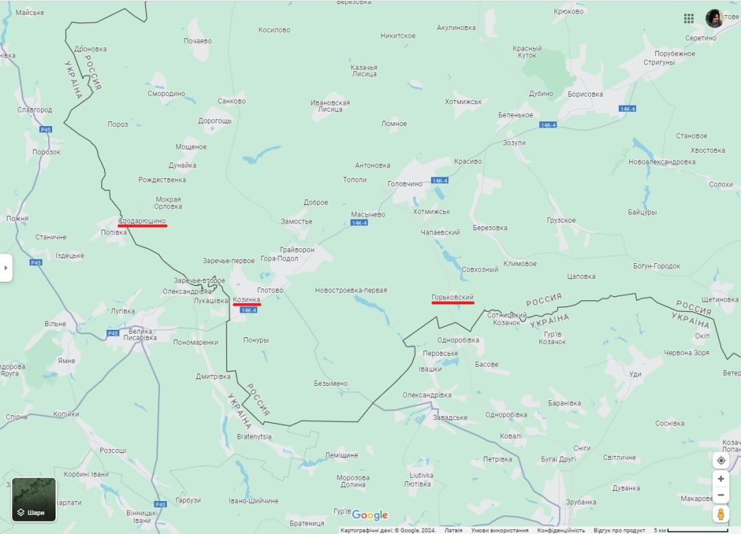 А тепер почитаємо Телеграм-канали Легіону «Свобода Росії», Російського добровольчого корпусу та Сибірського батальйону. З інформації, яка міститься в них, бачимо, що було проникнення в Тьоткіно (та підрив там трьох складів б/к), в Козинку, а також в селище Горьковський (це в двох кілометрах від кордону з боку Одноробівки в напрямку Головчиного). Яка ситуація наразі в цих населених пунктах, – невідомо – «туман війни»: можливо, частковий контроль, бої, входження та виходи. Інші пересування бійців ЛСР-РДК-СБ подані без локалізацій, тому встановити, де вони відбуваються, неможливо.
