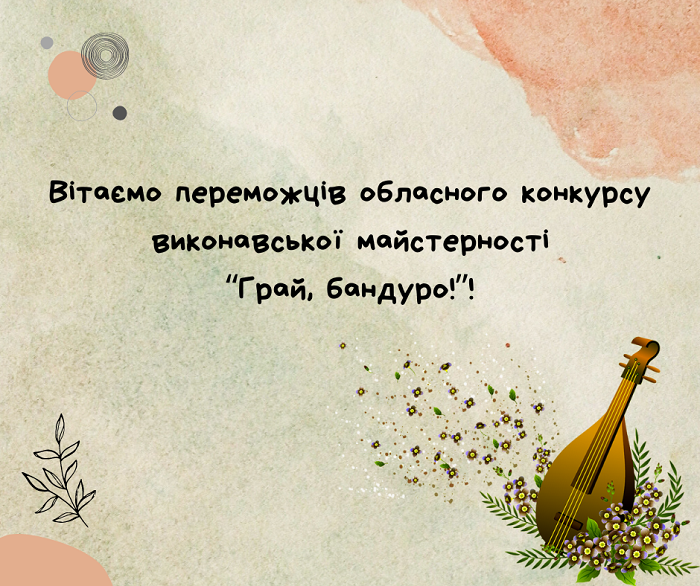 Нещодавно відбувся обласний конкурс виконавської майстерності учнів відділів народних інструментів музичних шкіл та шкіл мистецтв по класу бандури. У конкурсі “Грай, бандуро!” взяли участь 49 учнів з 25 музичних шкіл та шкіл мистецтв області. Серед них – вихованці Сокирянської музичної школи ім. Михайла Мафтуляка, які показали високі результати у своїй музичній стихії.