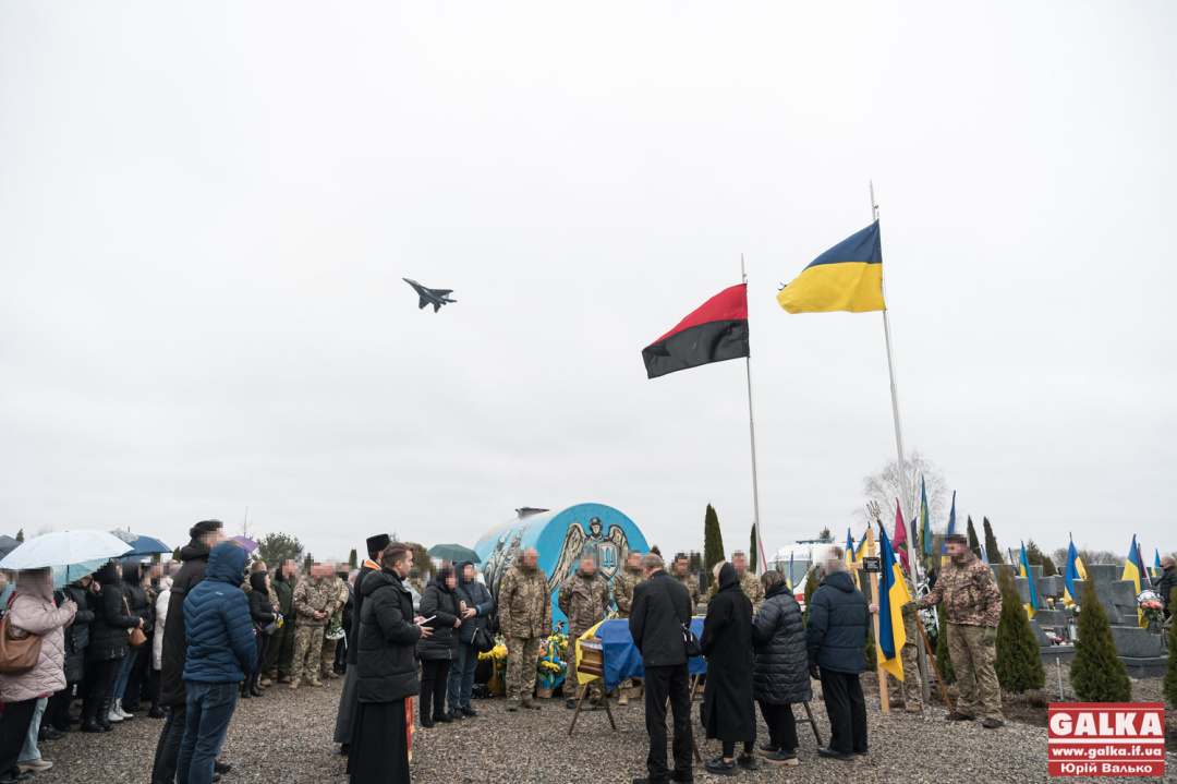 Колеги-пілоти вшанували пам’ять Захисника символічним прольотом винищувача над міським кладовищем. Від імені “Пласту” рідним передали “Залізний Пластовий Хрест”.