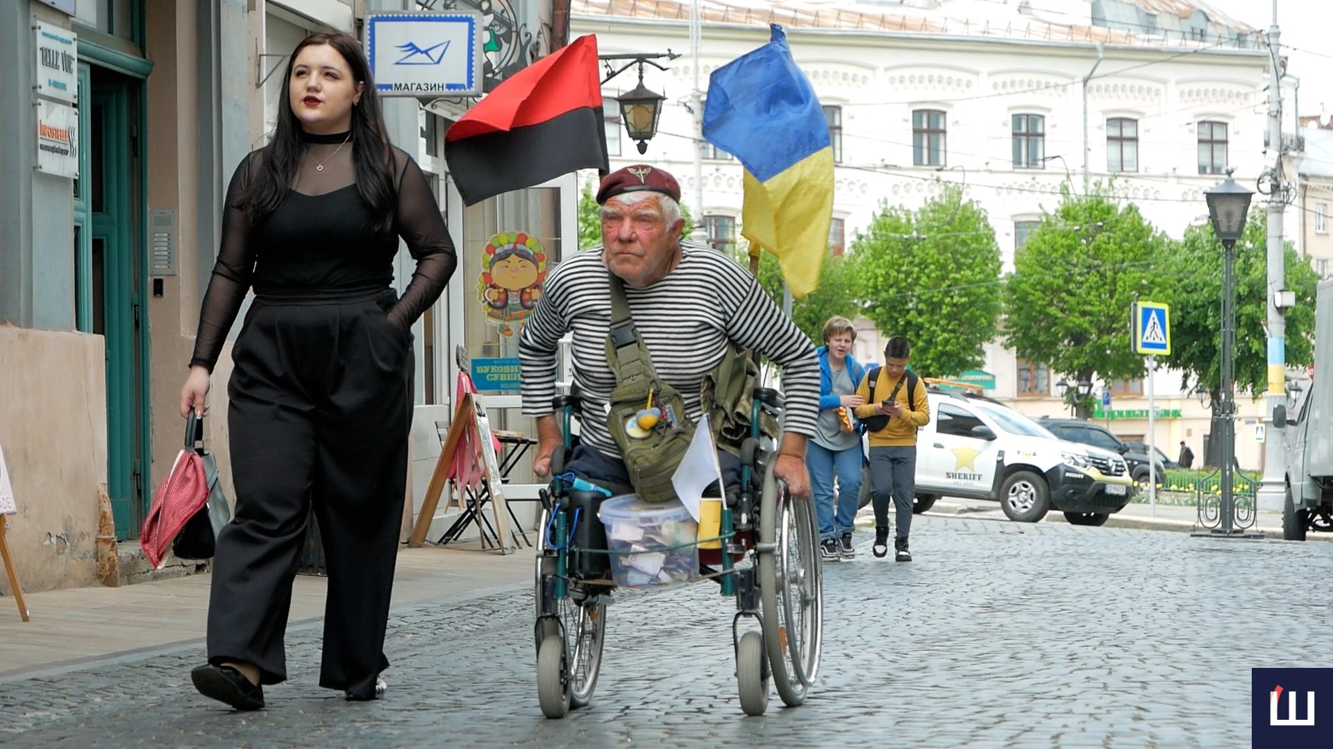 До крісла, на якому пересувається, прикріпив два прапори. На синьо-жовтому пише всі міста, в яких волонтерив. Загалом їх дванадцять, а Чернівці сьогодні стали тринадцятим містом.