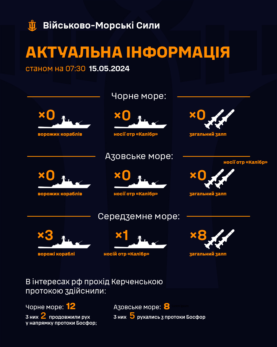 У Чорному та Азовському морях станом на 07:00 середи, 15 травня, російські військові кораблі відсутні.
