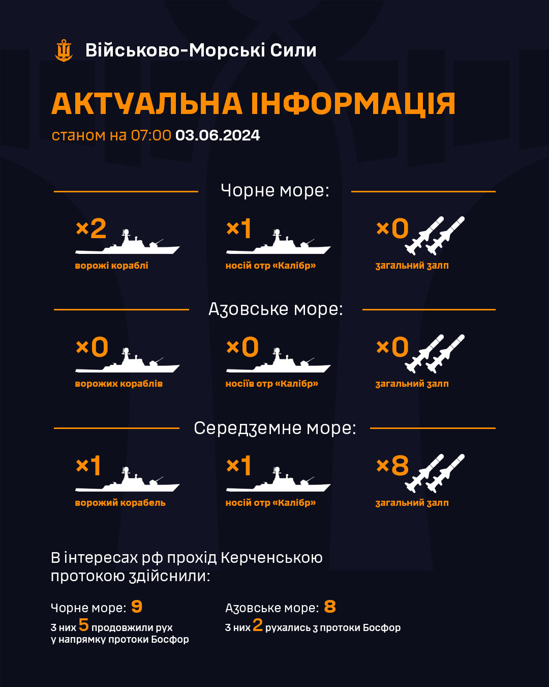 На бойовому чергуванні в Чорному морі станом на 07:00 3 червня Росія тримає два військові кораблі, один із яких є носієм крилатих ракет типу "Калібр".