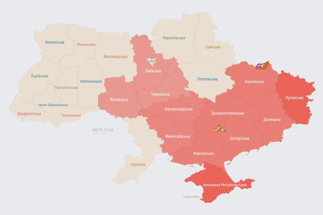 У низці областей оголошено повітряну тривогу через загрозу ворожих ударних безпілотників.