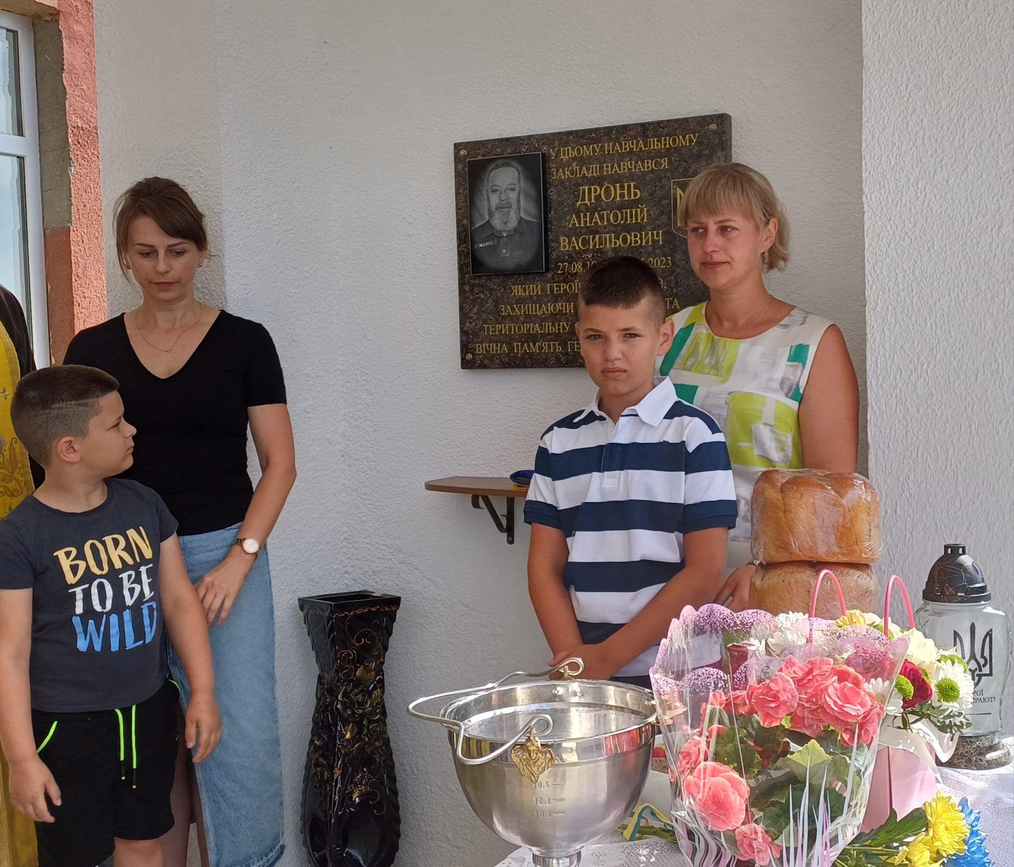 У Чернівецькій області у селі Баламутівка встановили меморіальну дошку волонтеру та захиснику Анатолію Дроню. Розташували її на фасаді школи, в якій навчався воїн.