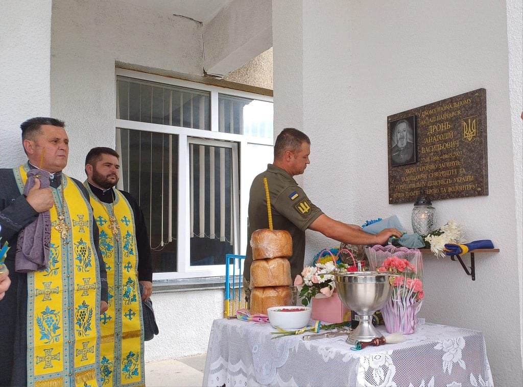 У Чернівецькій області у селі Баламутівка встановили меморіальну дошку волонтеру та захиснику Анатолію Дроню. Розташували її на фасаді школи, в якій навчався воїн.