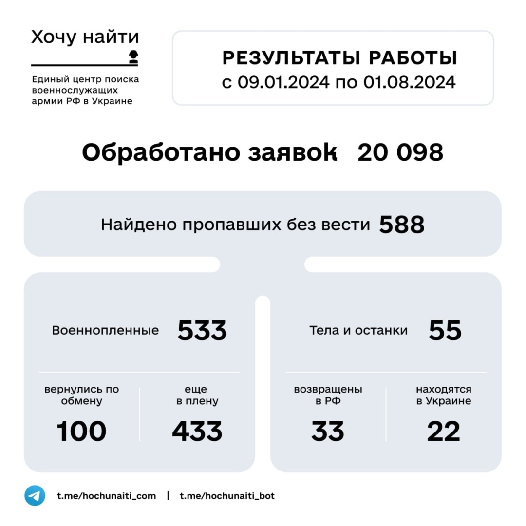«З моменту запуску проєкту “Хочу найти” у січні 2024 року… надійшло 20 098 заявок на пошук військовослужбовців армії РФ, які зникли безвісти в Україні», – йдеться у повідомленні.