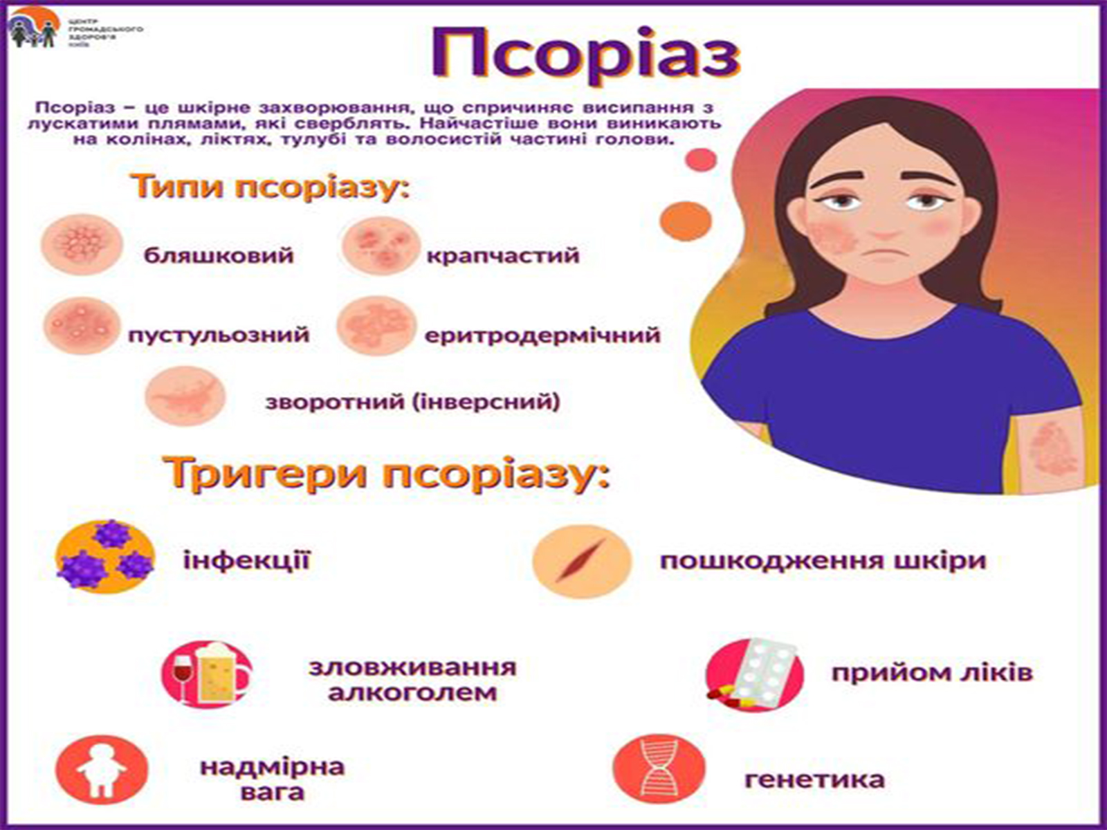 Псоріаз – це шкірне захворювання, що спричиняє висипання з лускатими плямами, які сверблять. Найчастіше вони виникають на колінах, ліктях, тулубі та волосистій частині голови. Це може бути болісно, заважати сну та зосередженню.