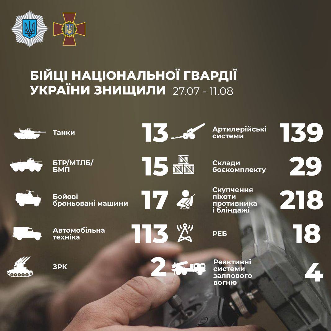 Національна гвардія України у цьому місяці знищила 139 артилерійських систем ворога, 13 танків, 32 одиниці бронетехніки і 2 зенітно-ракетних комплекси росіян.