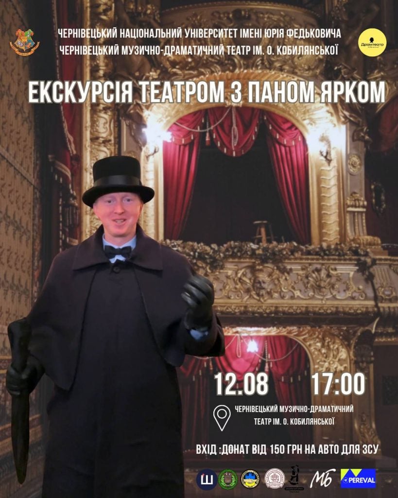 У Чернівцях проведуть благодійну екскурсію Чернівецьким муздрамтеатром імені Ольги Кобилянської. Всі кошти будуть спрямовані на авто для колишнього освітлювача сцени драмтеатру Романа Ясницького. Він зараз служить у 2 механізованому батальйоні 150 окремої механізованої бригади ЗСУ.