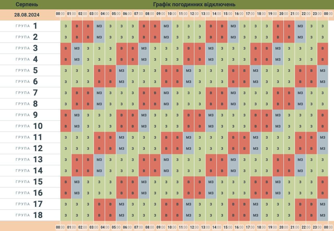 Як зазначають в обленерго, у графіку погодинних відключень відображаються години гарантованого включення електроенергії (зелені клітинки) та години, коли ваші оселі будуть точно знеструмлені (позначені червоним кольором).