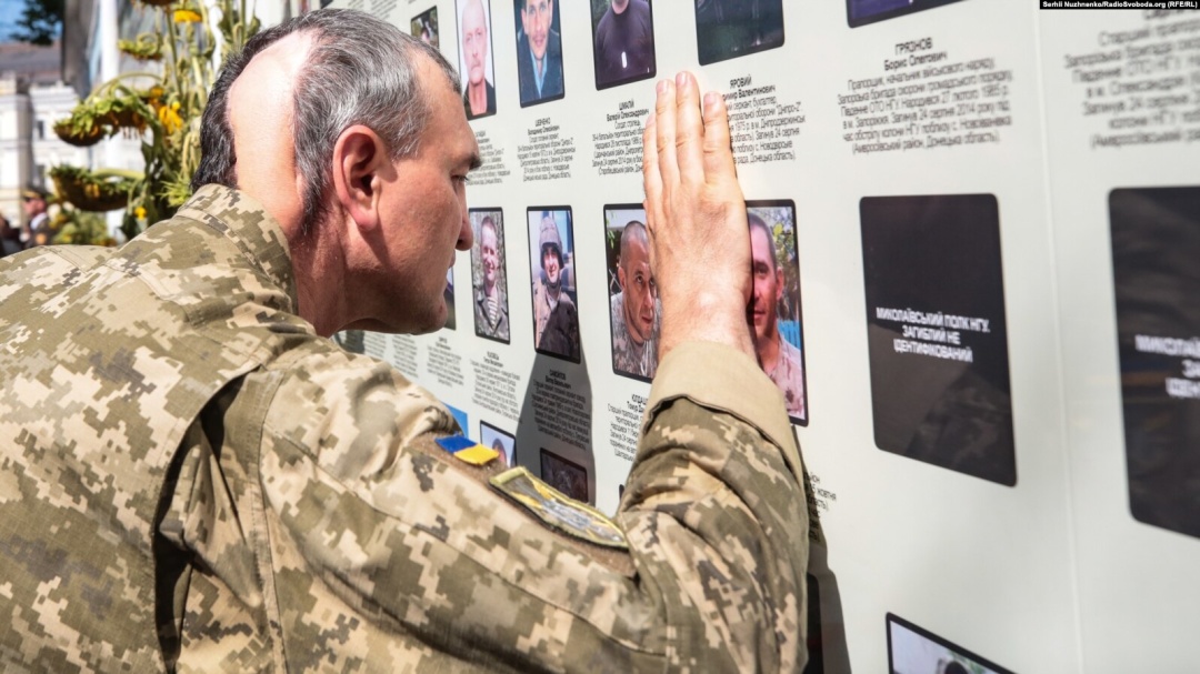 Ігор Гордійчук біля стіни з фотографіями загиблих побратимів. Фото radiosvoboda.org