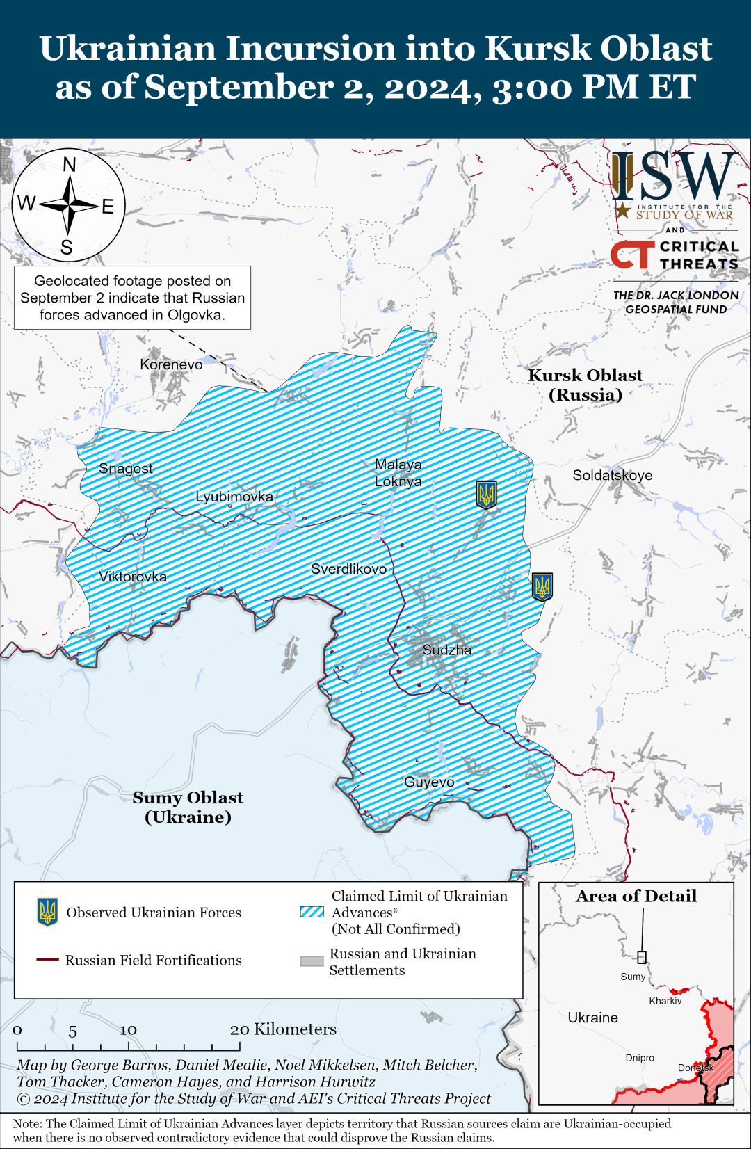 Геолокаційні кадри, опубліковані 2 вересня, вказують на те, що російські війська нещодавно відновили втрачені позиції поблизу Ольгівки (на схід від Коренево), за оцінками фахівців ISW, українські підрозділи, ймовірно, відійшли з цього населеного пункту.