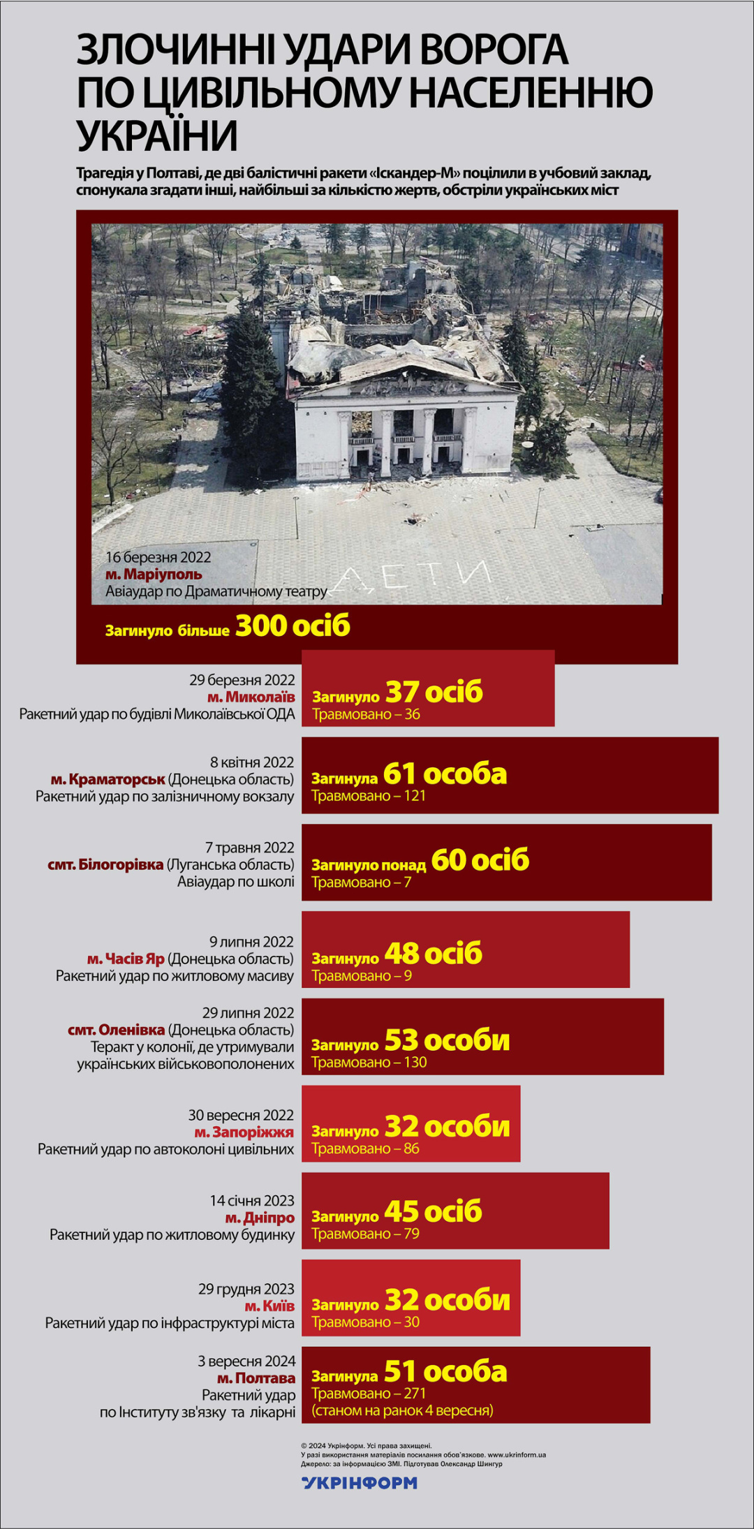 Трагедія у Полтаві, де дві балістичні ракети «Іскандер-М» поцілили в учбовий заклад, спонукала згадати інші, найбільші за кількістю жертв, обстріли українських міст