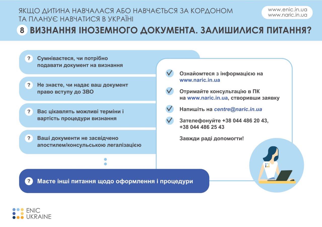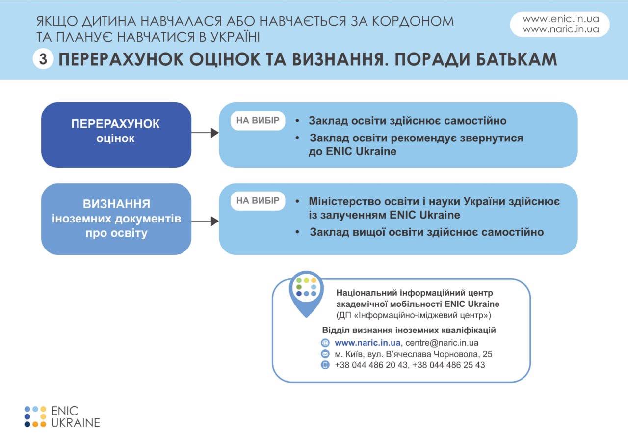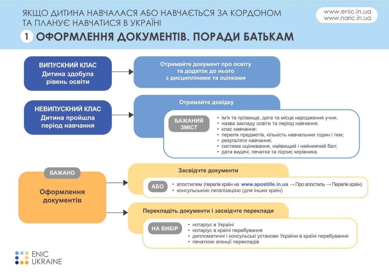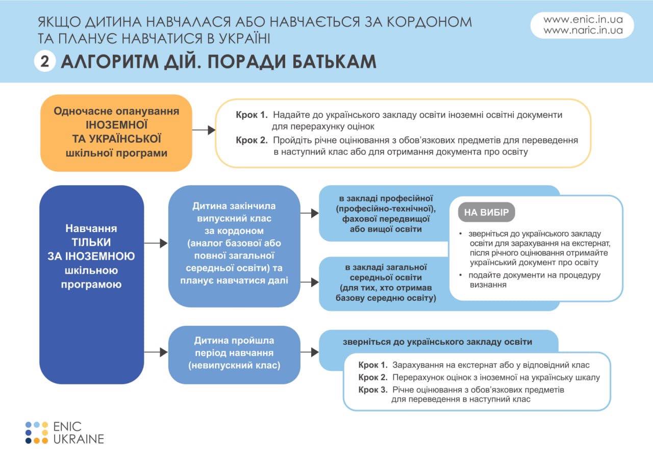 Щоб полегшити процес повернення школярів до українських закладів освіти, Мінреінтеграції пропонує батькам ознайомитися з інфографікою Національного інформаційного центру академічної мобільності ENIC Ukraine.