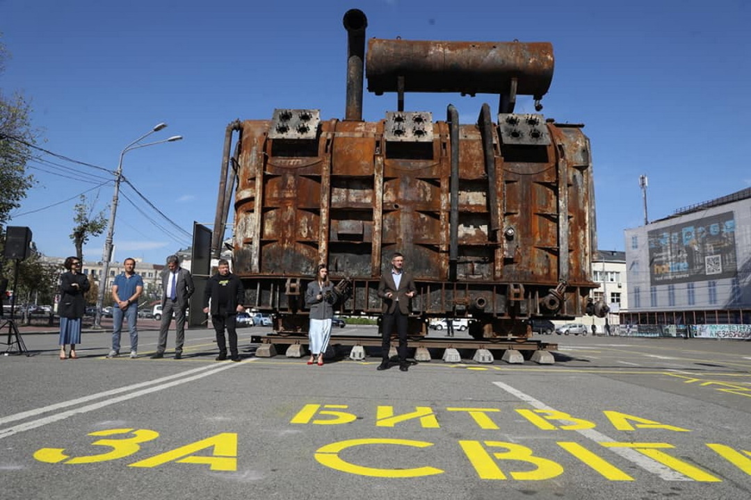 На Контрактову площу привезли знищений росіянами силовий трансформатор. Назвали цю інсталяцію «Битва за світло». Хто в Києві – варто подивитися