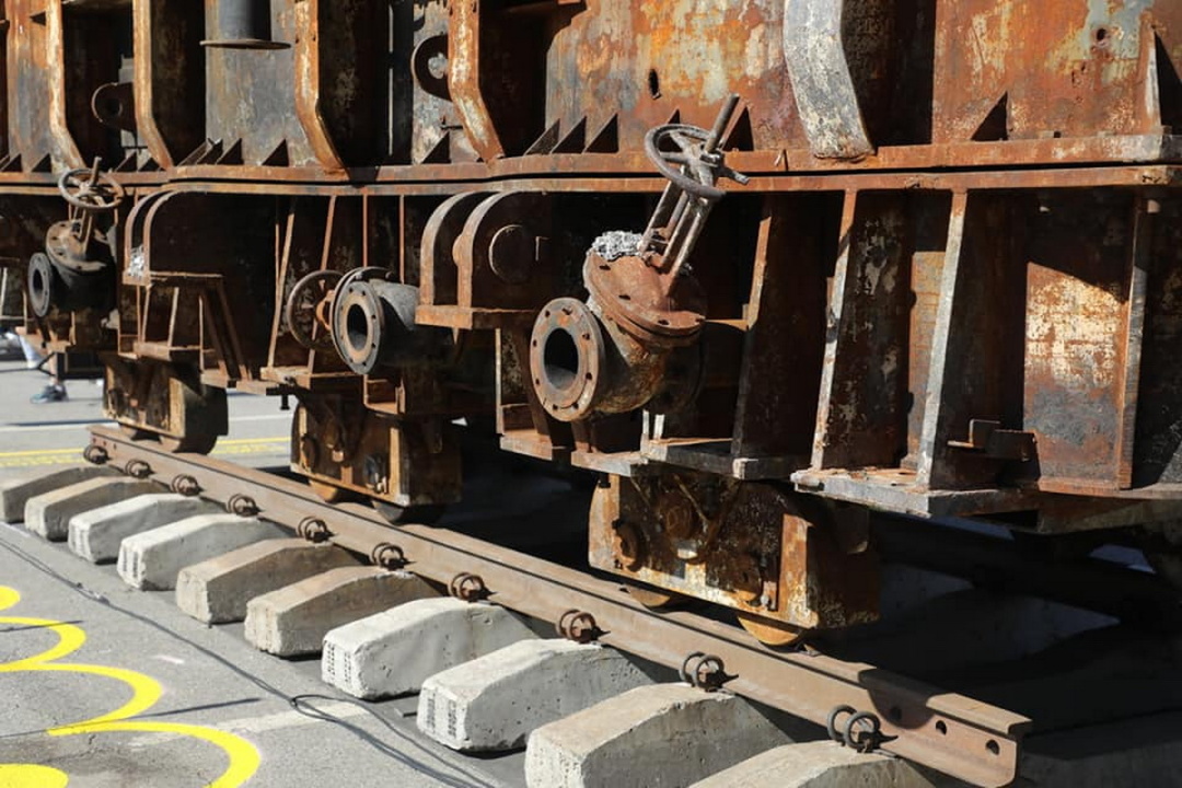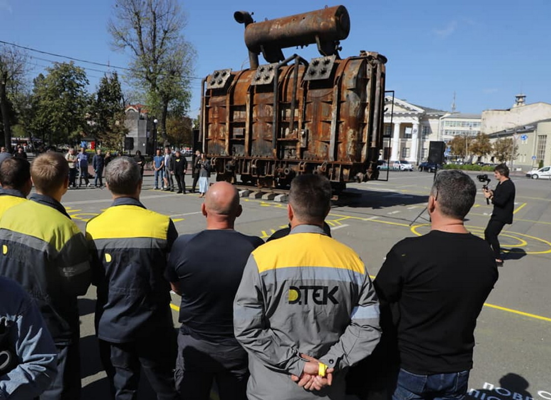 В ДТЕК планували давно, ще з 2022 року, привезти в столицю зразки знищеного обладнання, однак зупиняла саме складність доставки. Якщо придивитись уважно до згорілого трансформатора, то можна помітити, що він стоїть на колесах і на рейках, і це не дивно, адже його доставляли залізницею, вага такого обладнання понад 40 тонн.