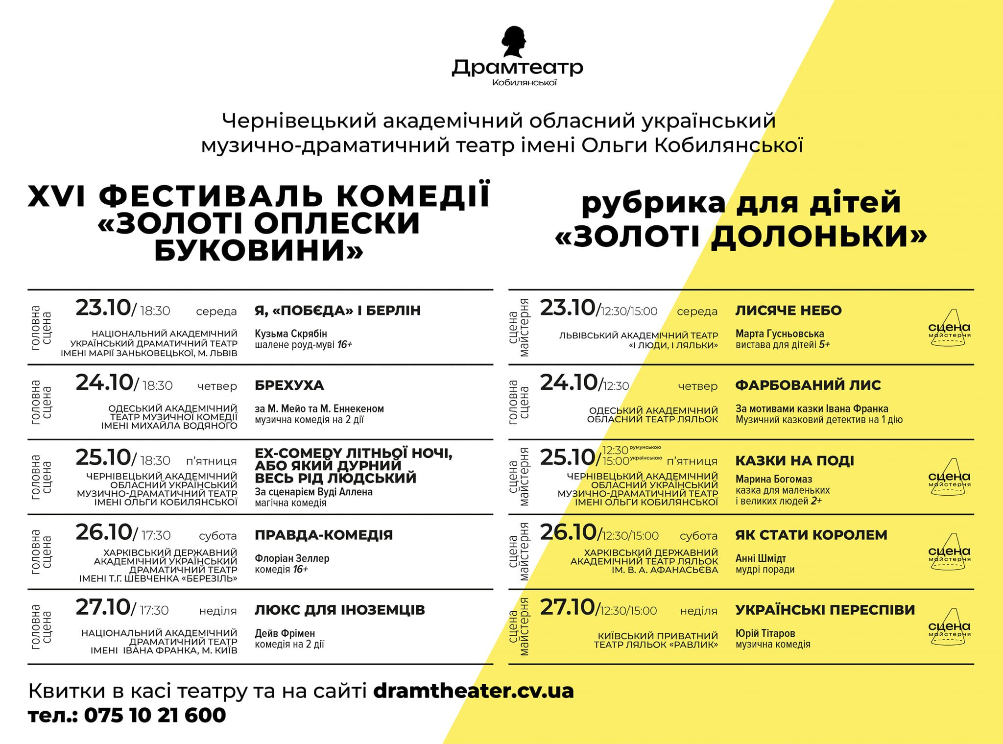 У Чернівецькому музично-драматичному театрі імені Ольги Кобилянської презентували програму XVI фестивалю комедії «Золоті оплески Буковини». Подію проведуть з 23 по 27 жовтня.