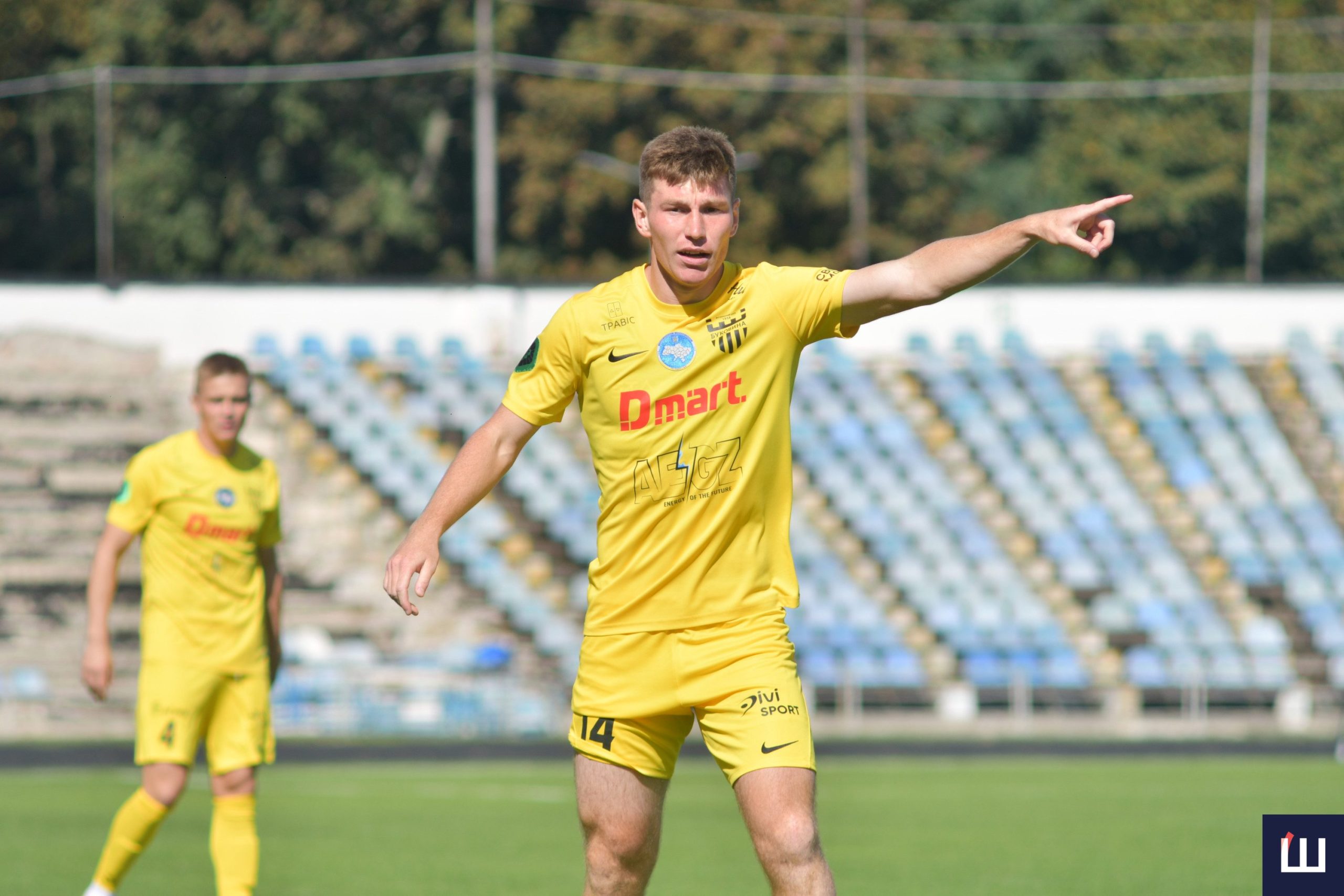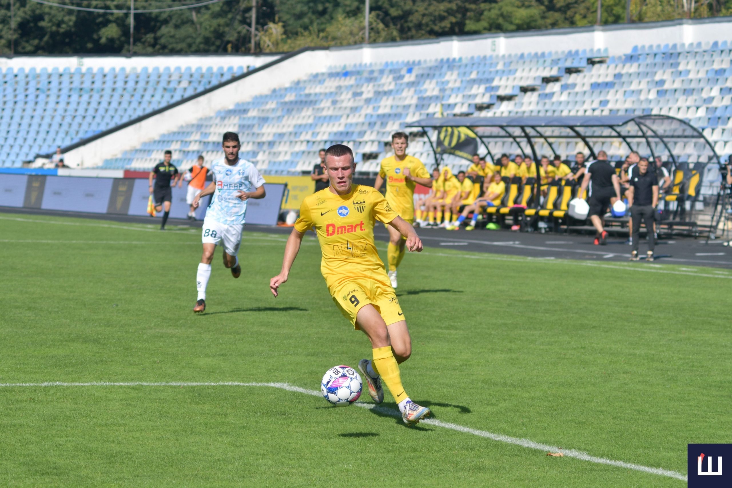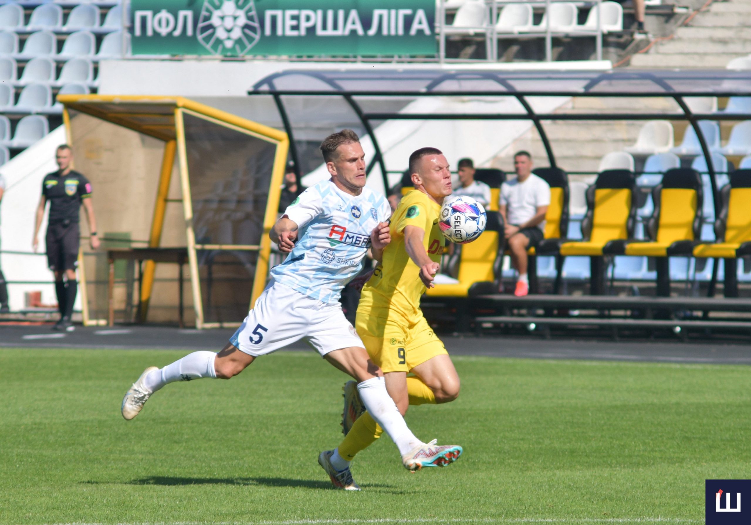 Захисник «Буковини» Дмитро Шинкаренко, який грає під номером «14», своїм голом відкрив рахунок у матчі проти «Минаю».