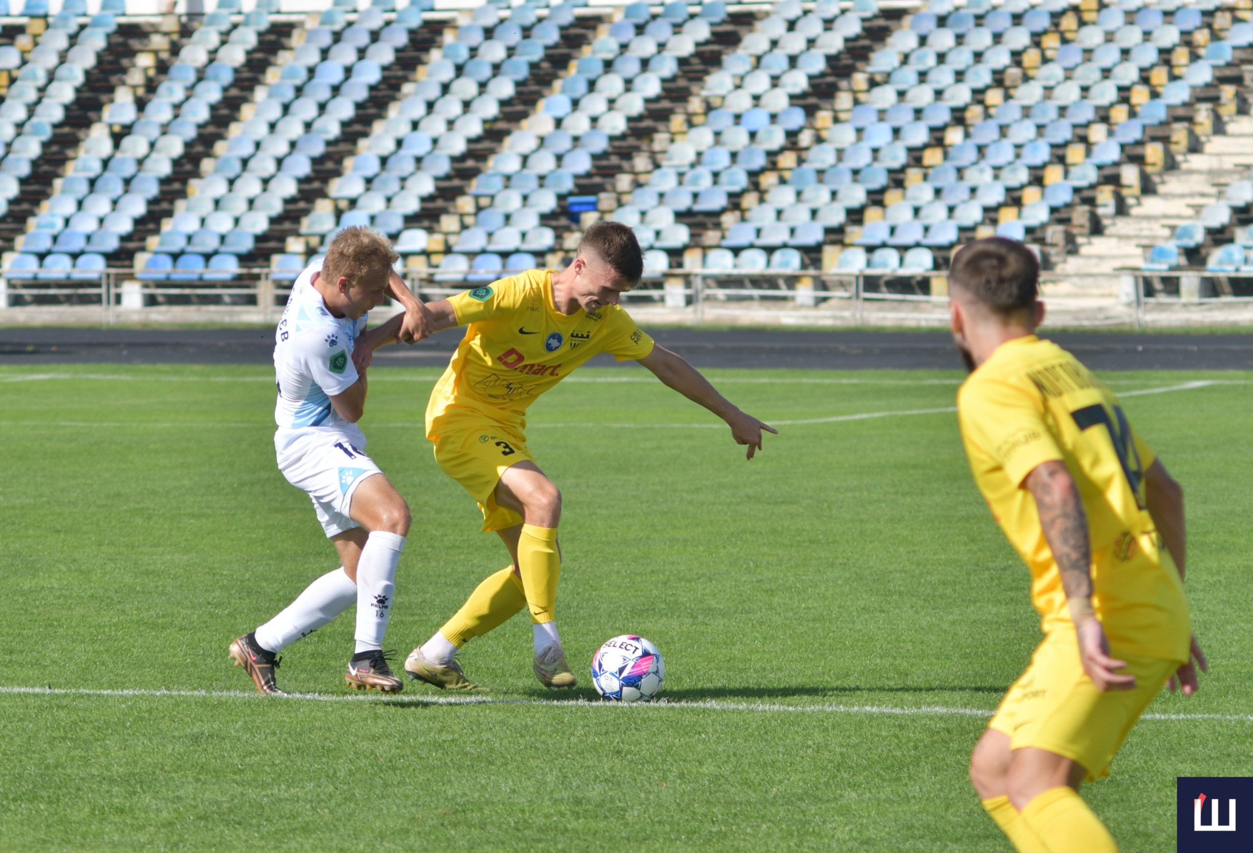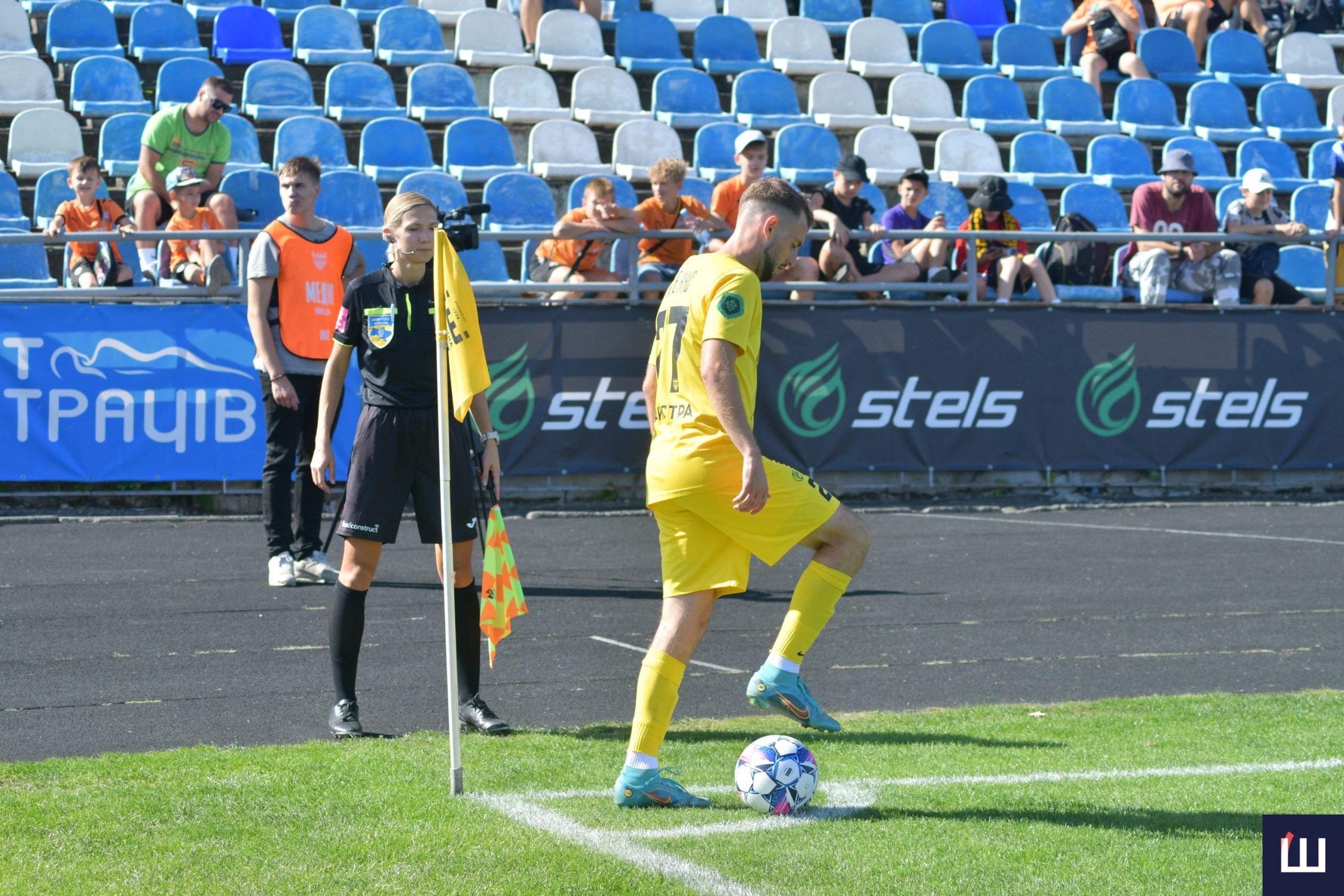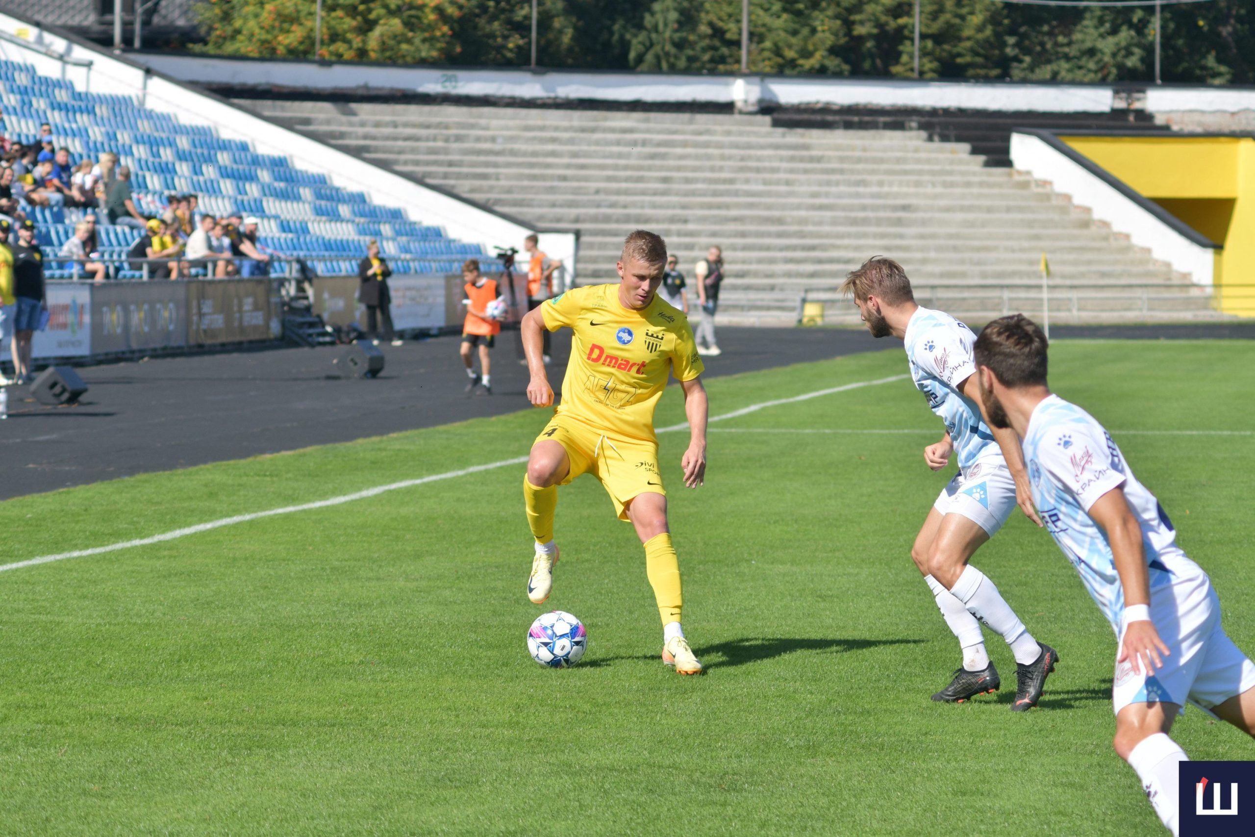 Захисник «Буковини» Дмитро Шинкаренко, який грає під номером «14», своїм голом відкрив рахунок у матчі проти «Минаю».