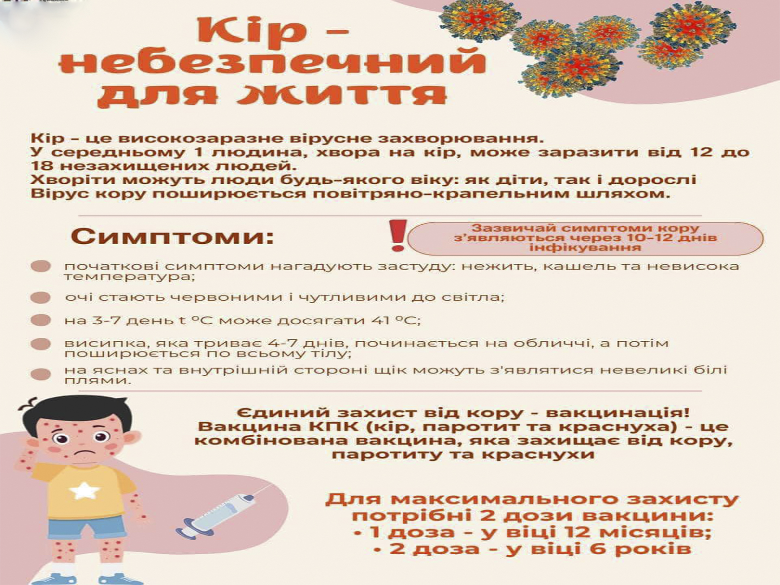 Вірус кору поширюється повітряно-крапельним шляхом. Кір – це серйозне захворювання, що може призвести до ускладнень, а інколи може бути смертельним.