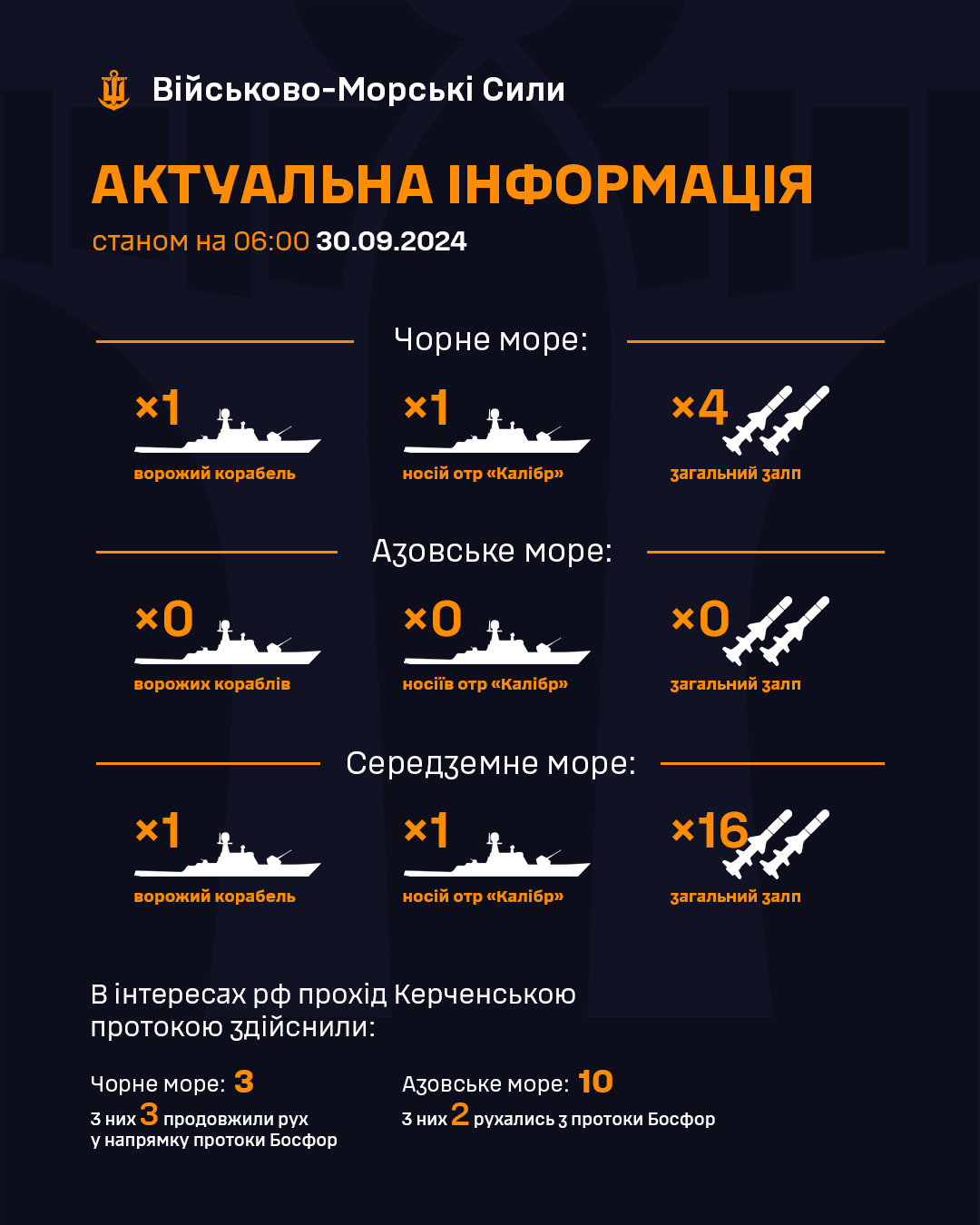 Про це йдеться в оперативній інформації ВМС ЗСУ станом на 6:00 30.09.2024 у Фейсбуці, передає Укрінформ.