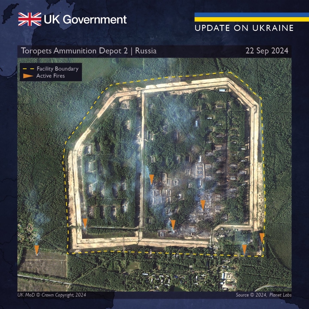 Експерти розвідки у зведенні згадали про атаку українських військ по російських складах боєприпасів у Тихорецьку (Краснодарський край) та у Торопці (Тверська область) у ніч з 20 на 21 вересня. Також аналітики вказали, що напередодні 18 вересня Україна здійснила успішний удар по іншому складу в Торопці, у результаті якого майже напевно було знищено щонайменше 30 тисяч тонн боєприпасів у відкритому та бункерному сховищах.