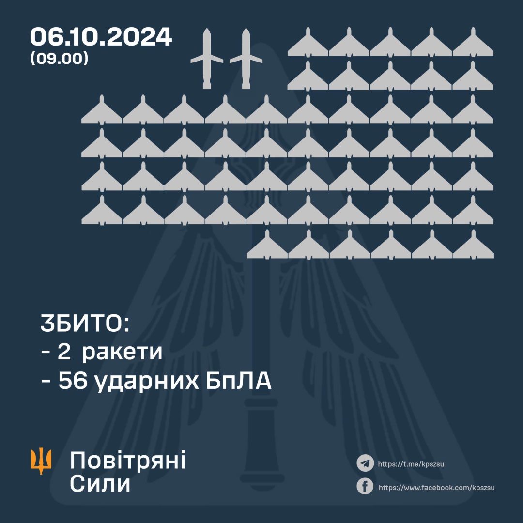 Авіація, зенітні ракетні війська, підрозділи РЕБ та мобільні вогневі групи Повітряних сил та Сил оборони України у ніч на 6 жовтня знищили 56 ударних БПЛА та дві ракети ворога.