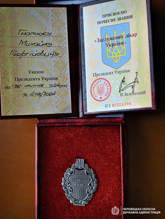 “Мав честь сьогодні привітати знаного буковинського лікаря-онколога, завідувача кардіоревмоонкогематологічного відділення ОКНП “Чернівецька обласна дитяча клінічна лікарня” Михайла Гнатюка із присвоєнням почесного звання “Заслужений лікар України”. Передав нагороду Михайлові Георгійовичу під час зустрічі. Звання Заслуженого лікаря йому присвоєно Указом Президента за значний особистий внесок у розвиток вітчизняної системи охорони здоров’я, надання кваліфікованої медичної допомоги і рятування життя людей в умовах воєнного стану, сумлінне виконання професійного обов’язку та з нагоди Дня медичних працівників за поданням Чернівецької обласної військової адміністрації”, – йдеться у повідомленні голови Чернівецької ОВА Руслана Запаранюка.