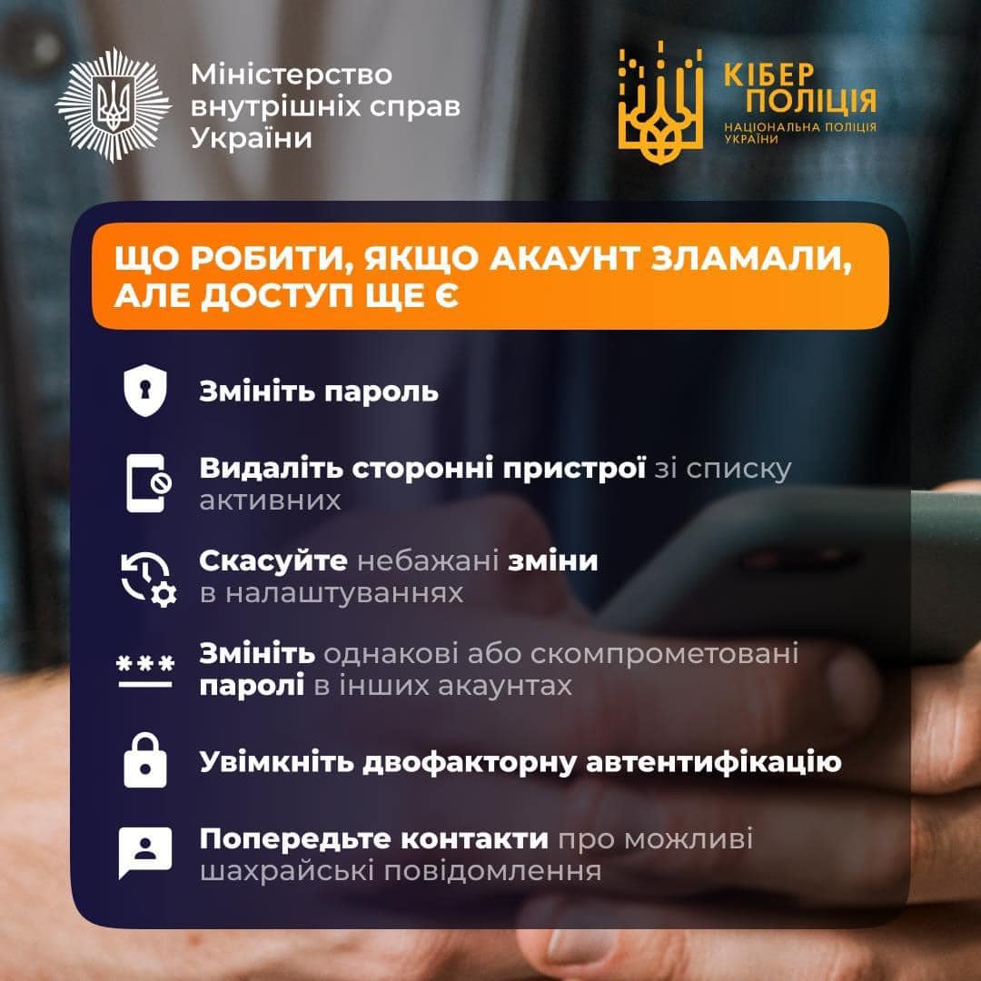 Національна поліція України разом з Кіберполіцією розповідають, як вчасно розпізнати ознаки компрометації, алгоритм дій у випадку зламу та як захистити свій акаунт.