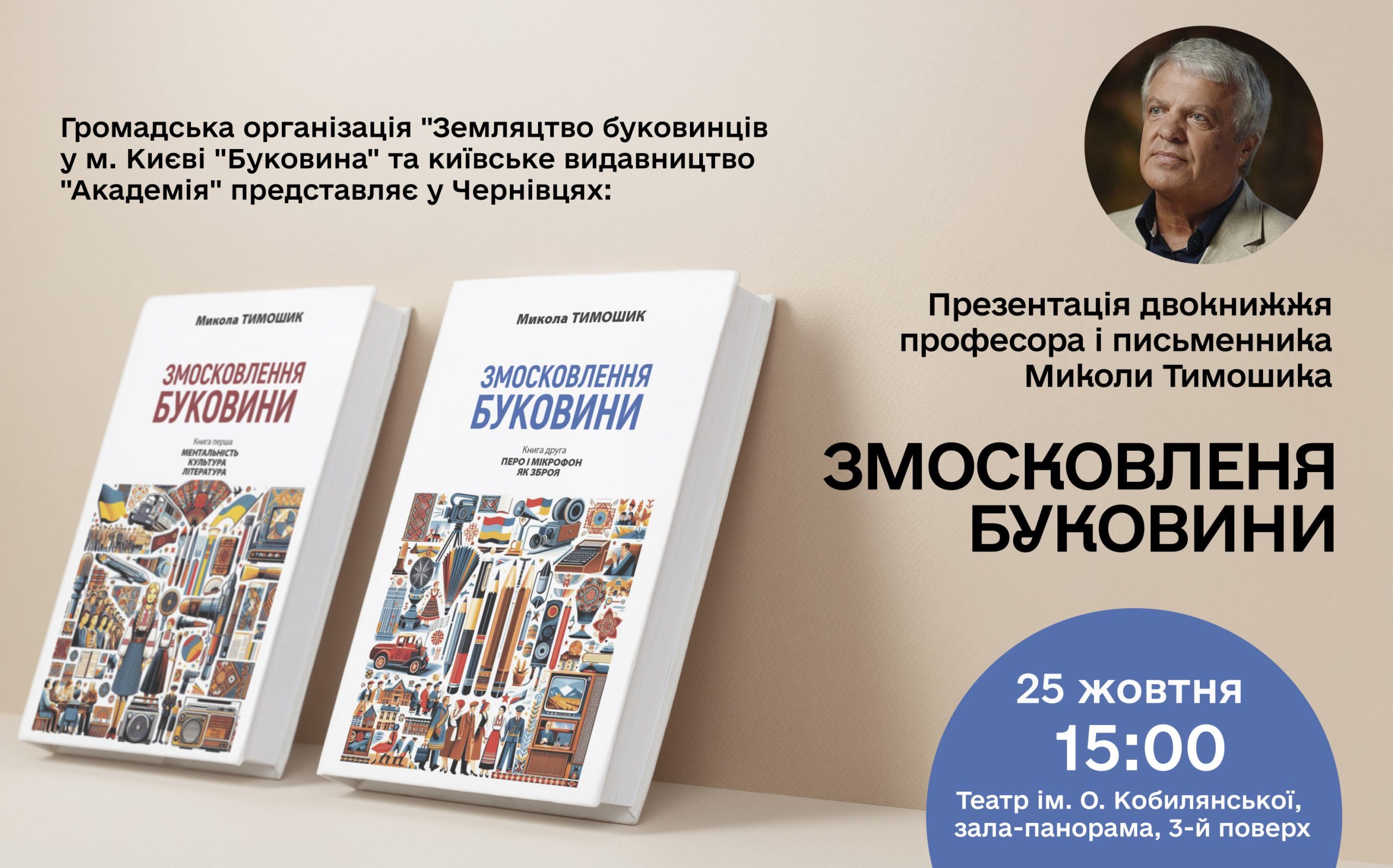 У Чернівцях проведуть презентацію двокнижжя професора Миколи Тимошика «Змосковлення Буковини». Захід відбудеться завтра, 25 жовтня, о 15:00 у залі-панорамі Чернівецького музично-драматичного театру імені Ольги Кобилянської.