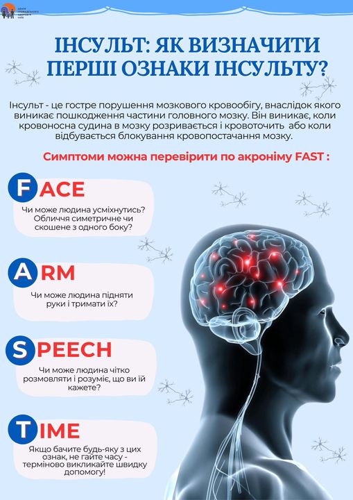Інсульт – це гостре порушення мозкового кровообігу, внаслідок якого виникає пошкодження частини головного мозку. Він виникає, коли кровоносна судина в мозку розривається і кровоточить аббо коли відбувається блокування кровопостачання мозку. Розрив або закупорення перешкоджає надходженню крові та кисню до тканин головного мозку. Без кисню клітини та тканини мозку пошкоджуються та починають помирати протягом декількох хвилин.
