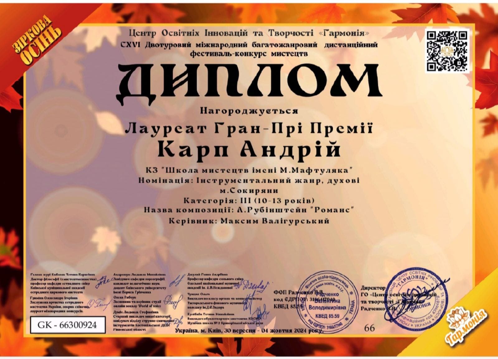 Лауреатом гран-прі премії CХІІІ Міжнародного багатожанрового двотурового дистанційного фестивалю-конкурсу мистецтв «Зіркова осінь» став Андрій Карп, під керівництвом викладача-наставника Максима Валігурського.