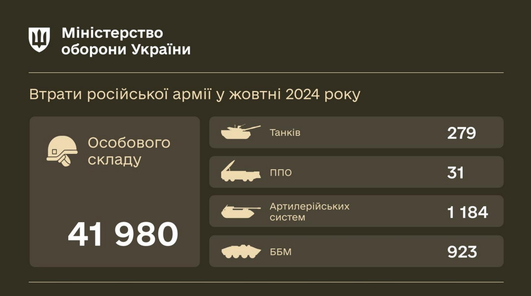 Безповоротні та санітарні втрати російських військ в особовому складі за жовтень сягнули 41 980 осіб, що перевищує чисельність умовно понад трьох мотострілецьких дивізій.