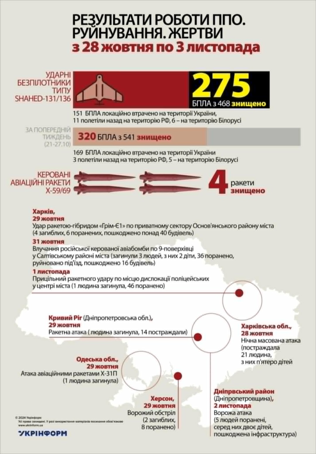 Внаслідок обстрілів російськими окупантами з 27.10 по 03.11 Донецької, Херсонської, Дніпропетровська, Запорізької, Сумської та Харківської областей 17 людей загинуло, 80 отримали поранення.