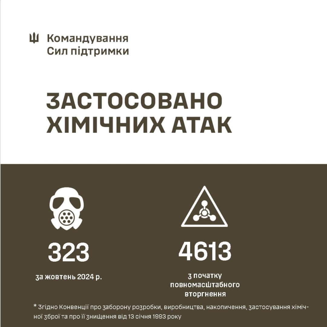 «Поруч із звичайними засобами вогневого ураження противник застосовує боєприпаси, споряджені небезпечними хімічними речовинами, такі як К-51 та РГ-ВО, які є засобами боротьби із заворушеннями та заборонені для використання у якості засобів ведення війни. Також є значна частка боєприпасів, що містять небезпечні хімічні сполуки невстановленого типу. За жовтень 2024 року підрозділами радіаційної, хімічної, біологічної розвідки Сил підтримки Збройних сил України зафіксовано 323 таких випадки», – йдеться в повідомленні.